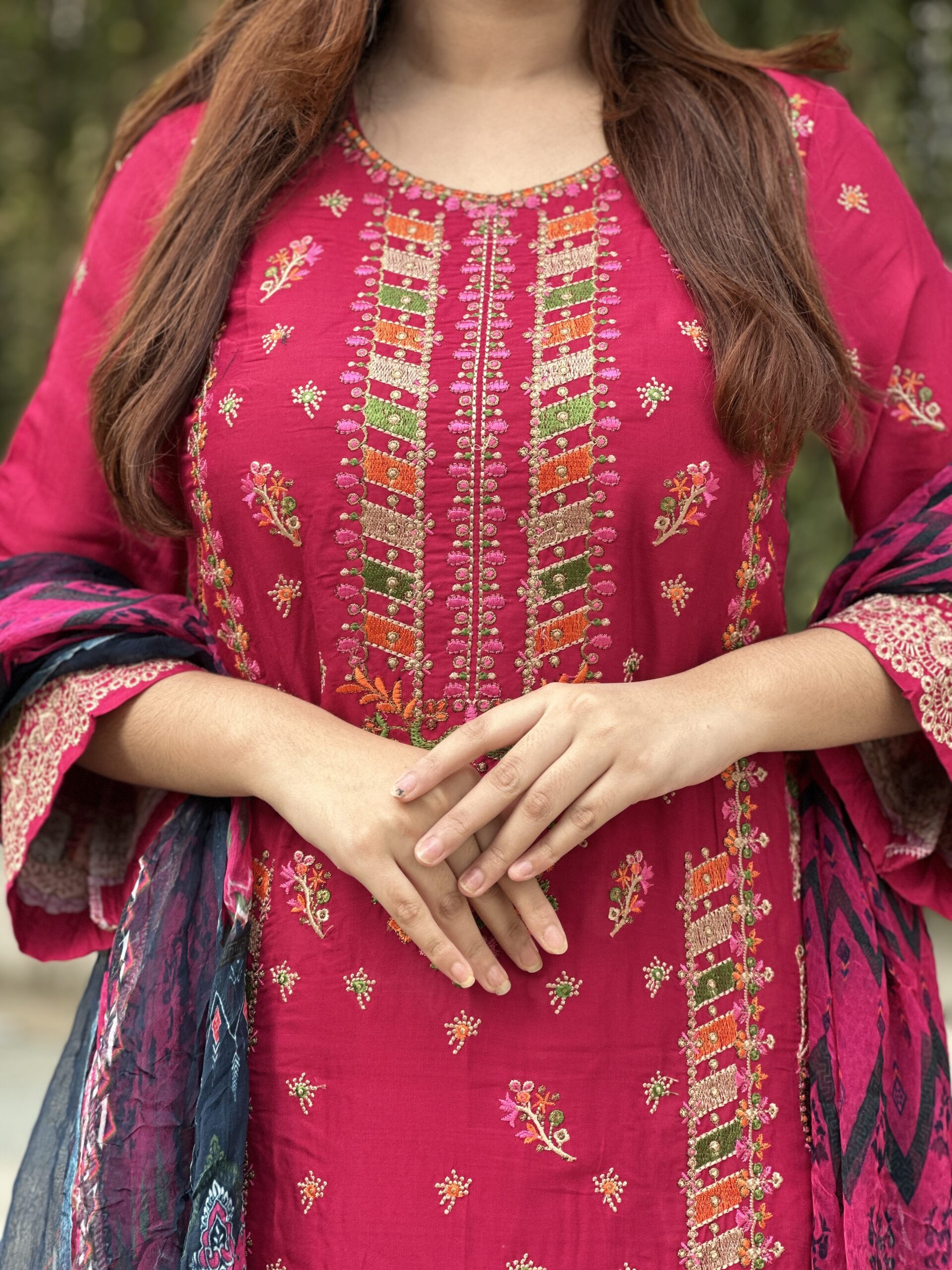 ড্রেস রিয়ন কটন- এমব্রয়ডারি কাজ করা আছে।